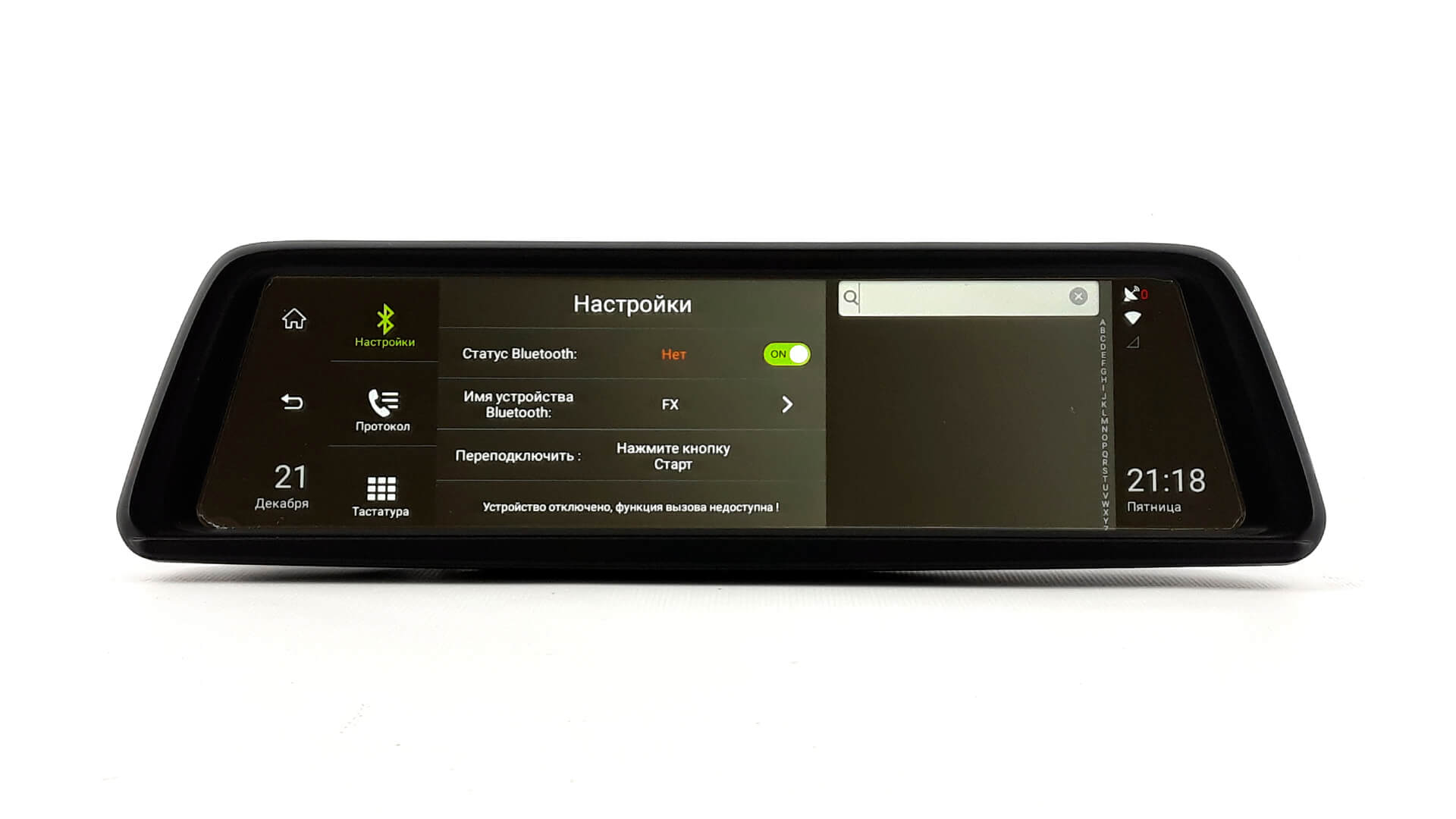 Phisung V9 оснащено FM-трансмиттером, который позволяет передавать музыкальные композиции с устройства на автомобильную магнитолу, посредством FM-диапазона. Никакой сложности в настройке нет. Необходимо выбрать любой канал, на смарт-зеркале, нажать кнопку «Открыть», после чего необходимо настроить автомобильную магнитолу на этот же диапазон.